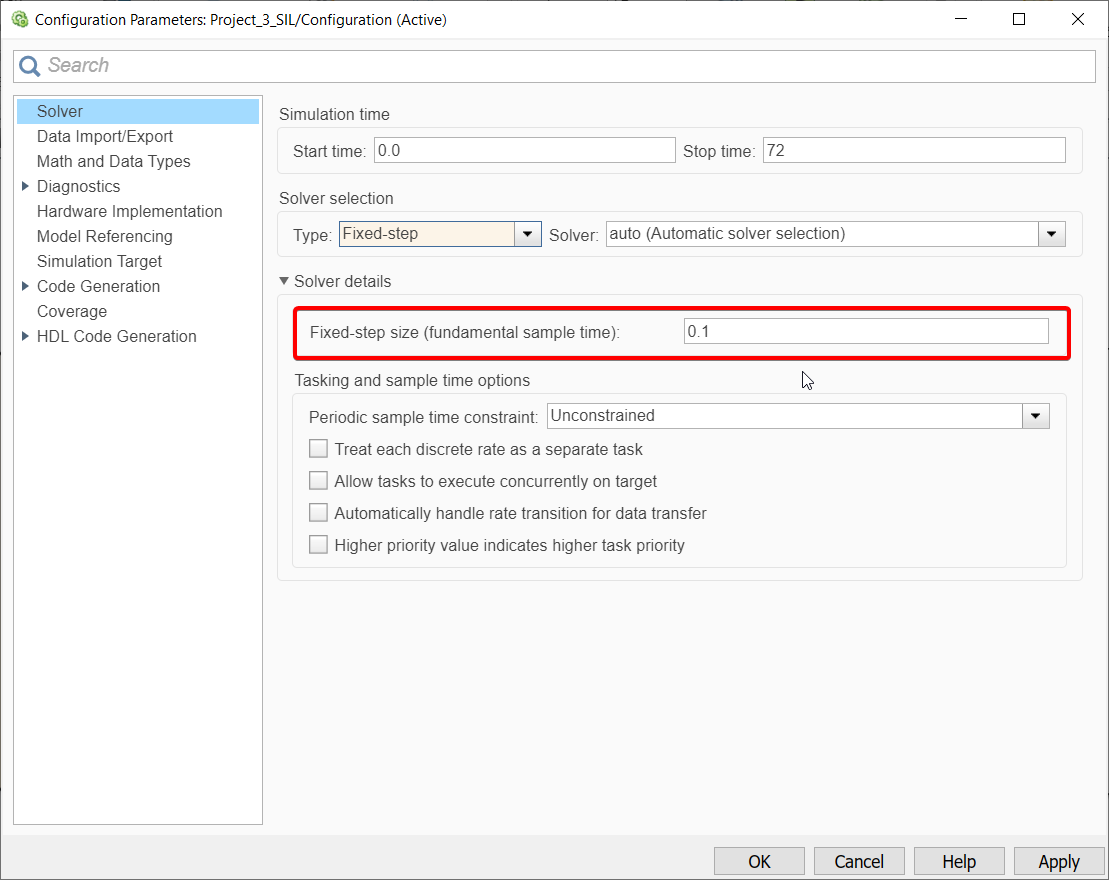A sample time of 0.1 means that a data point will be collected and every 0.1 second. With a larger sample time certain data points are sometimes missed, which affects the accuracy of the result. Generally, a small sample time of 0.1 second would allow every data point to be collected, hence resulting in an accurate result. A Fixed-step solver means this sample time of 0.1 remains fixed throughout the simulation.