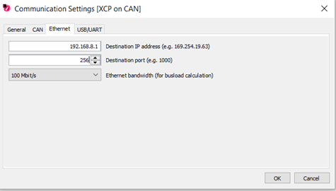 6.Open the HANtune software. Open the waijun2_xcp_demo.hml file included inside the xcp_demo folder. Select communication>communication settings to open up the communication settings tab shown below. Under the general tab select XCP on Ethernet as the communication driver. Under the Ethernet tab enter the correct IP address and port number from step 3.