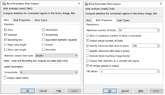 Use the BW image out from the MatLab function block for this. Do the morphological image processing to smooth out the noises of the image and connect the image to the “Blob Analysis” block. Blob analysis mask is shown by the following images. For more details on this block, please refer to this document: https://in.mathworks.com/help/vision/ref/blobanalysis.html