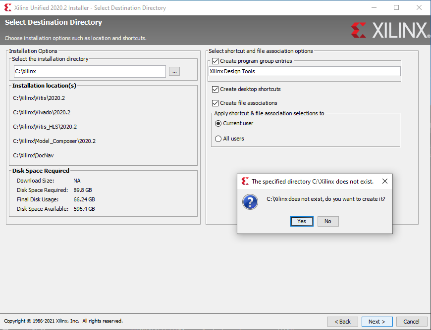 Step 10: If a folder named Xilinx is not available in the installation directory specified, you will be prompted to automatically create one. Click Yes and click Next >